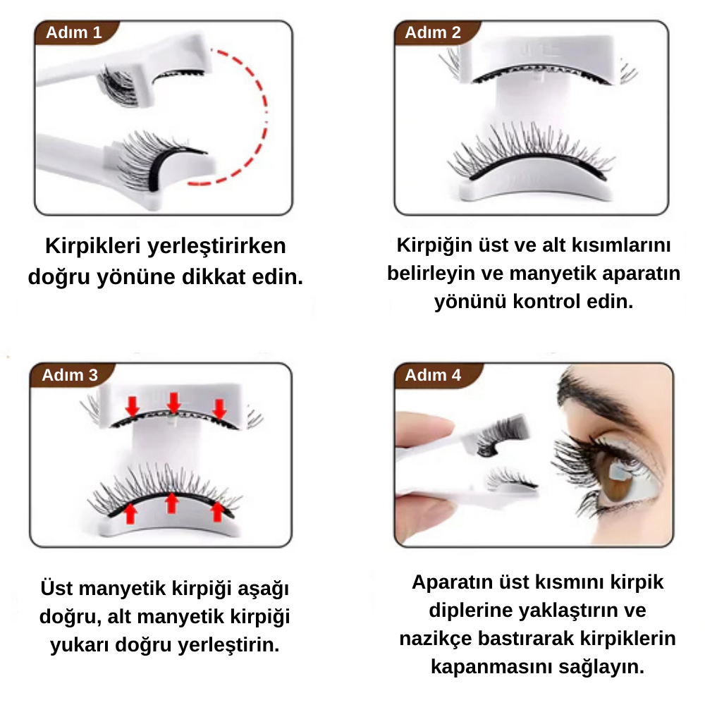 Çift mıknatıs teknolojisi sayesinde kirpikler birbirine tutunur ve doğal kirpiklerini nazikçe kavrayarak güvenli ve konforlu bir kullanım sağlar.